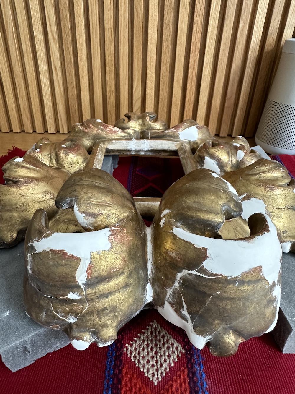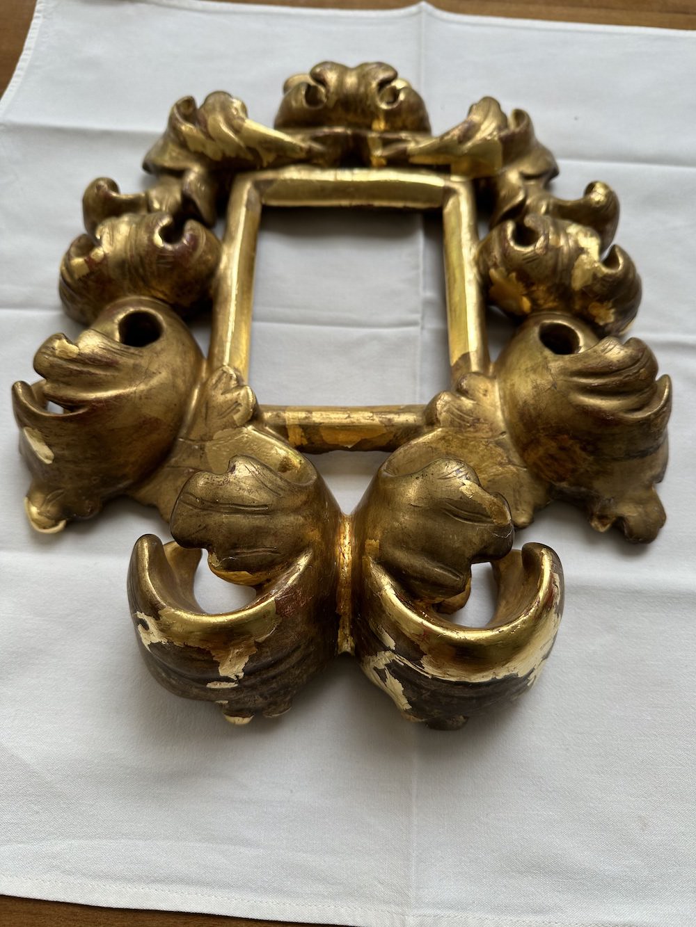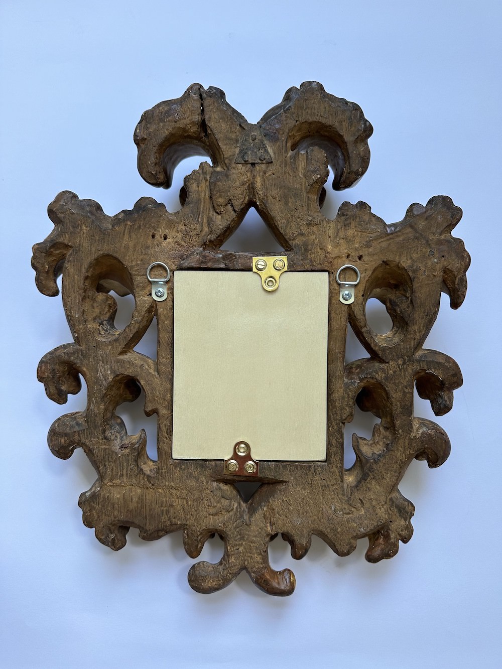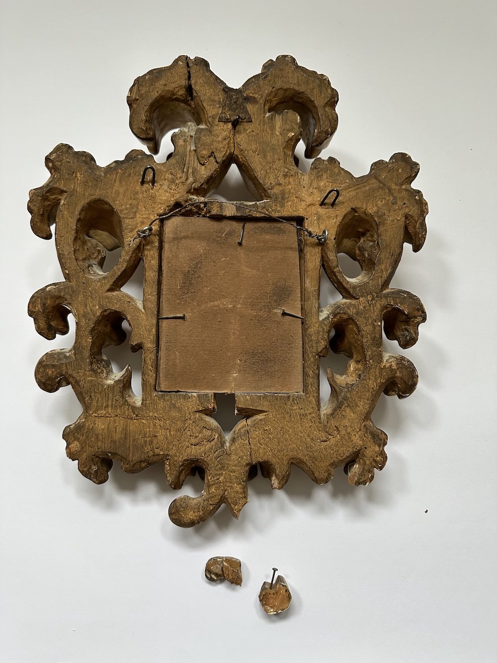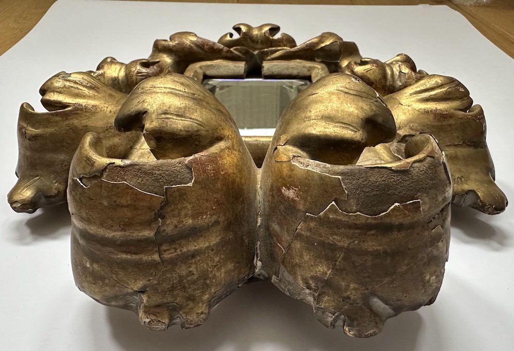 The structure was unstable, with a crack running across the entire frame—on the top sight edge and bottom foliage. The top ornament was also mobile, with a visible crack at the back. A corroded fitting located above this crack suggested an older repair. Detached fragments were present on the sight edge and bottom foliage, available to be re-adhered. The surface exhibited active flaking of the gilded layer, with losses to the gesso particularly affecting the top ornaments. A soiling layer was present across the entire frame. The bottom sight edge and an area on the top ornaments showed exposed gesso, indicating overcleaning and removal of the gold layer. The mirror lacked protection at the back and was held in place by three nails, while a fourth nail was found attached to a detached fragment.